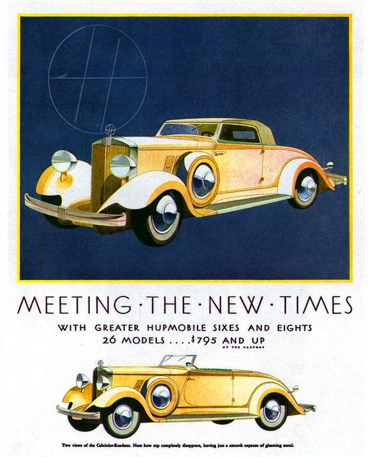 An example of how 1932 Loewy-design Hupmobiles were presented to potential buyers. The car in the main illustration is highly distorted, though the lower drawing is closer to being correct.